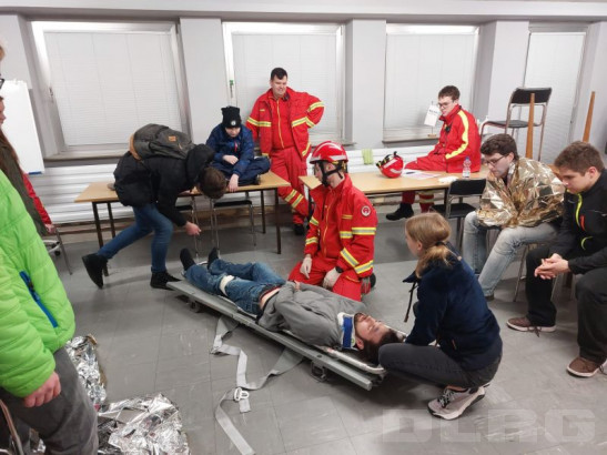 Ein interessanter Abend für alle Teilnehmenden. Gestern durfte unser gemeinsames Jugend-Einsatz-Team erste praktische Erfahrung im Bereich Einsatz sammeln. Dazu fuhren wir von Gresaubach aus in einer Kolonne von drei Einsatzfahrzeugen zum "Einsatzort" in der Unterkunft der OG Lebach. Dort wartete auf unsere jungen Mitglieder, dank der vielen Schminke und Vorbereitung durch die Ausbilder beider Ortsgruppen, mehrere Einsatzbeispiele auf sie. Im ersten Fall wurde ein Patient aufgefunden, der bei Arbeiten im Keller gestürzt war und dadurch einen offenen Knochenbruch erlitten hatte. Zusammen mit bereits erfahreneren Einsatzkräften wurde die Versorgung des Patienten gemeinsam organisiert und erfolgreich durchgeführt. Dabei lernten die Teilnehmer, wie wichtig es ist, im Team zusammenzuarbeiten ... Mehr erfahren